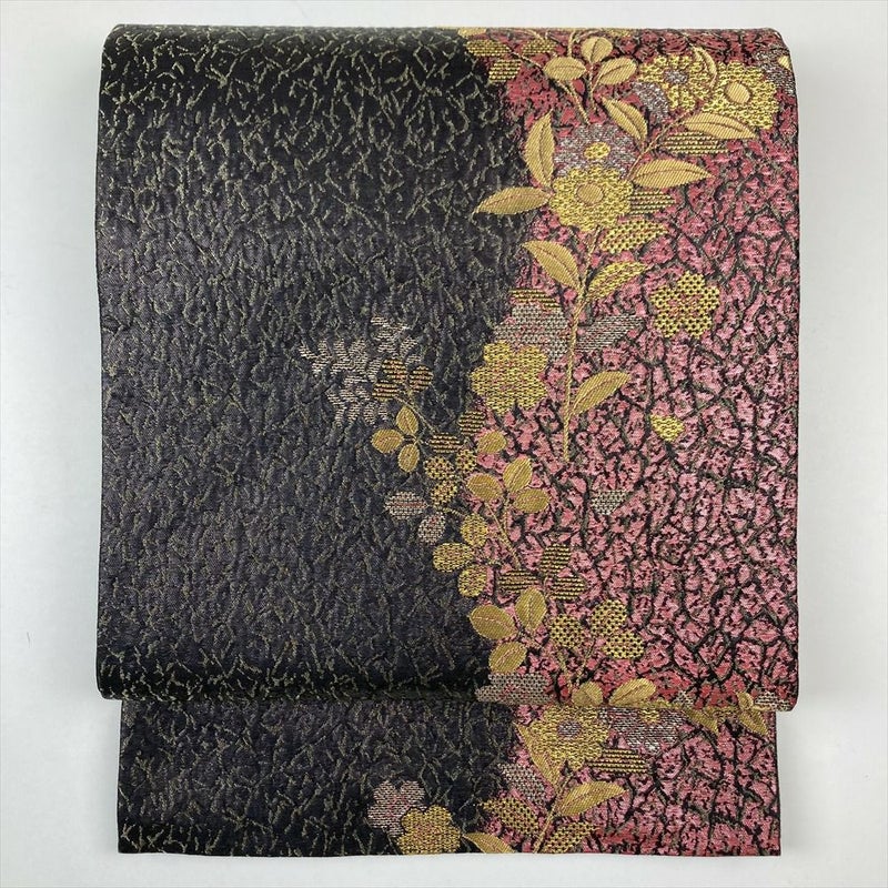(中古)袋帯 黒 セミフォーマル カジュアル 六通 ふくれ織り 金糸 銀糸 干割れ 四季花