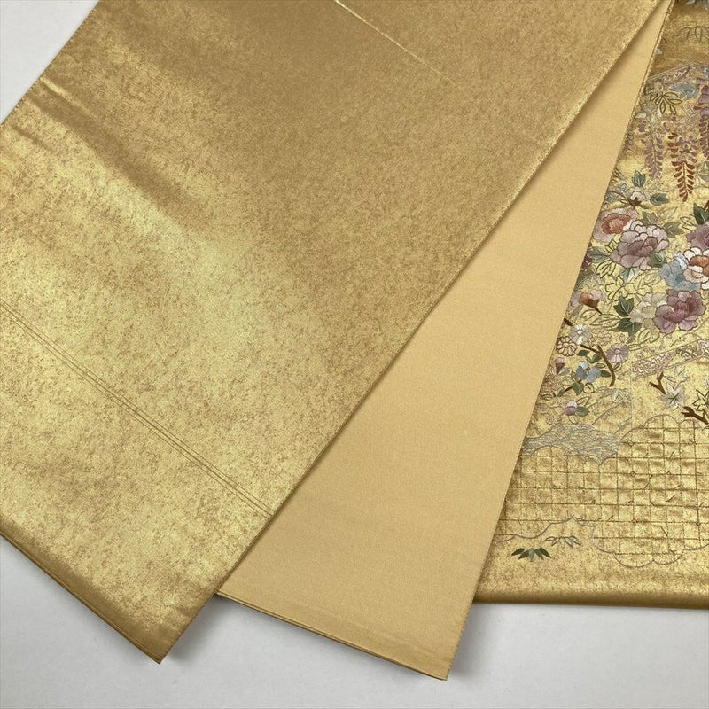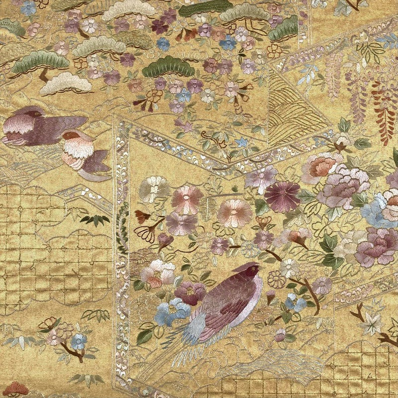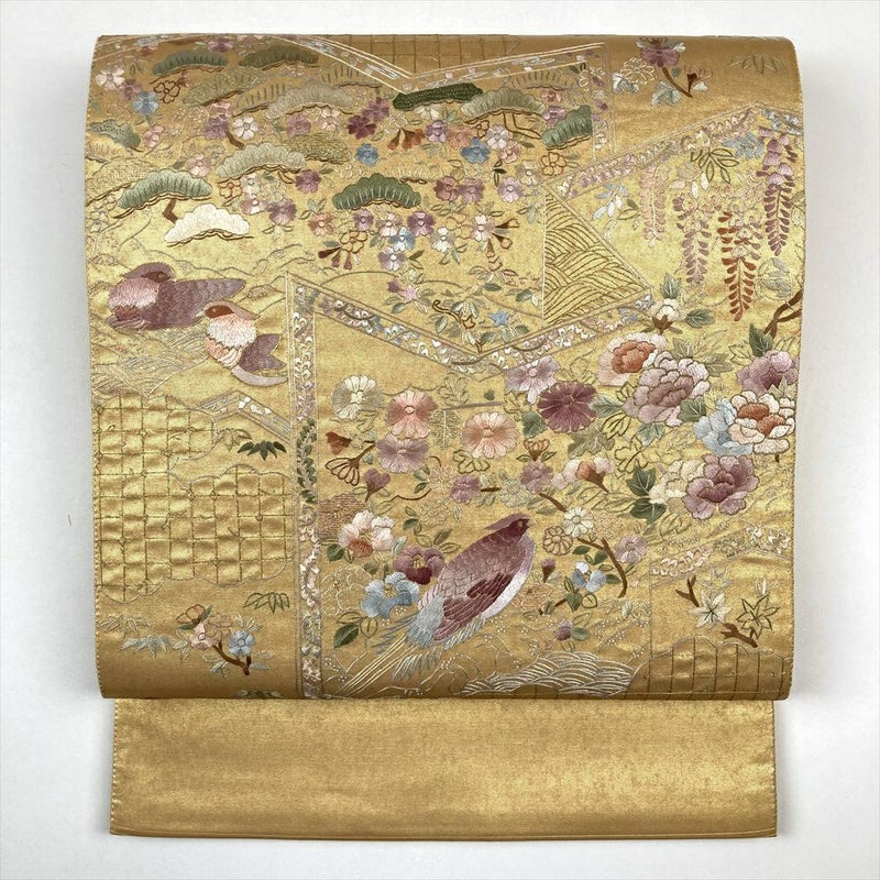 金色の地に美しいお色の刺繍が施されています。よく見てみると花鳥の緻密な模様です。上品で華やかな着姿を演出いたします。フォーマルな席での着用をおすすめいたします。表裏の手先からお太鼓にかけ締めジワ、折りジワが見られます。