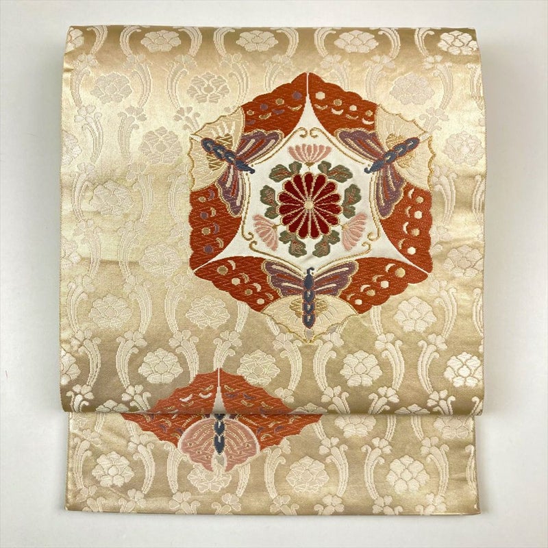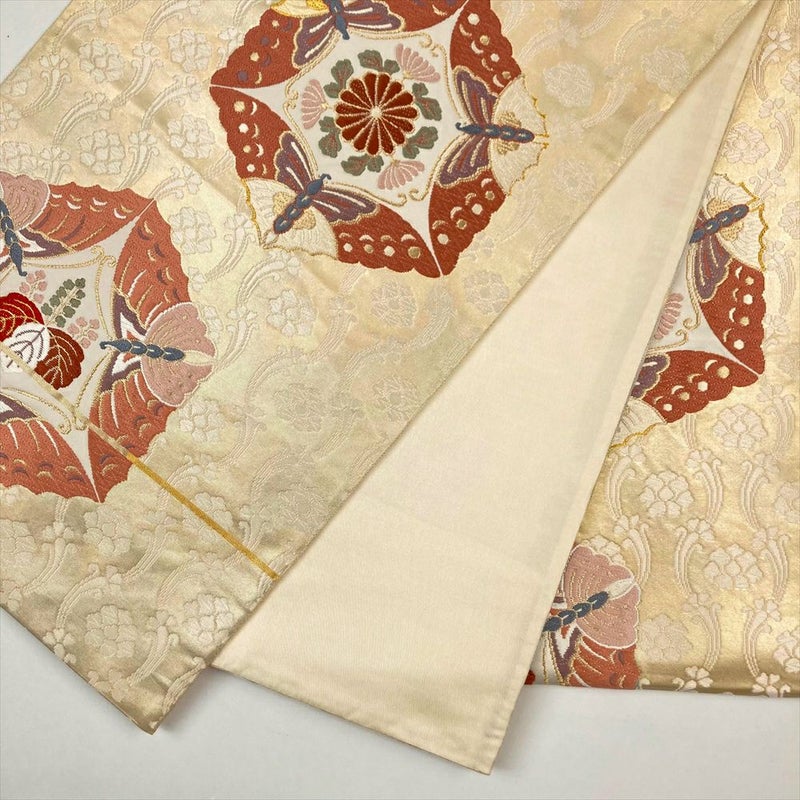 (中古)袋帯 金 フォーマル セミフォーマル 六通 金糸 蝶 菊 桐 有職文様