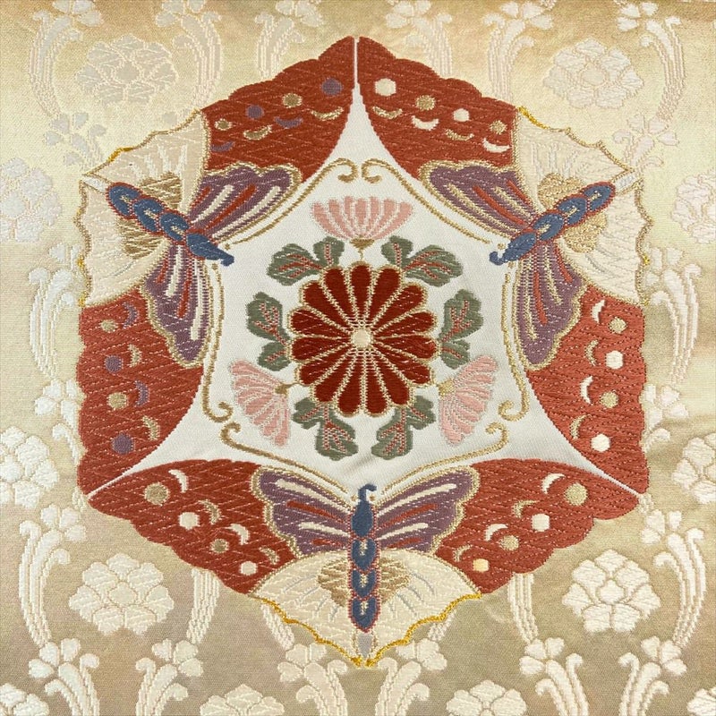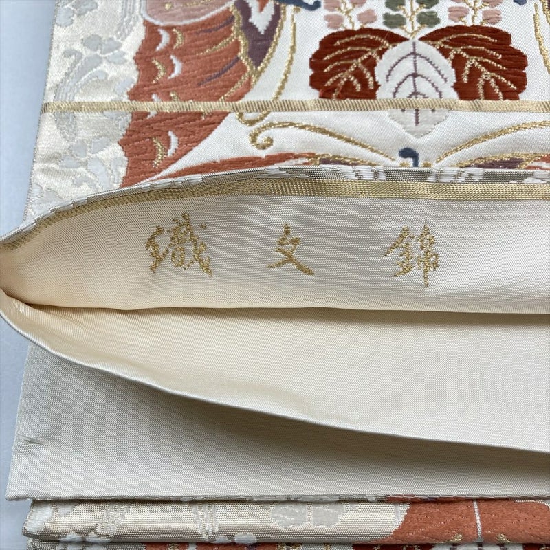 上品な色目の地色に、金糸、色糸で有職文様が織り出され、クラシカルな印象です。フォーマル、セミフォーマル向きの帯になります。成人式・結婚式や披露宴・パーティーなどフォーマルのお席にお使いいただけます。たれ先に織文錦の縫い取りがあります。中無地、手先からお太鼓にかけて締めジワが見られます。
