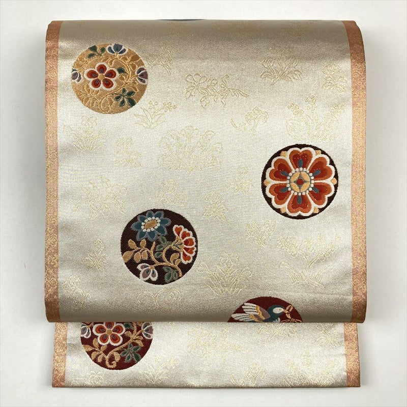 (中古)袋帯 ベージュ フォーマル セミフォーマル 六通 花 鳥 蝶 天平文様