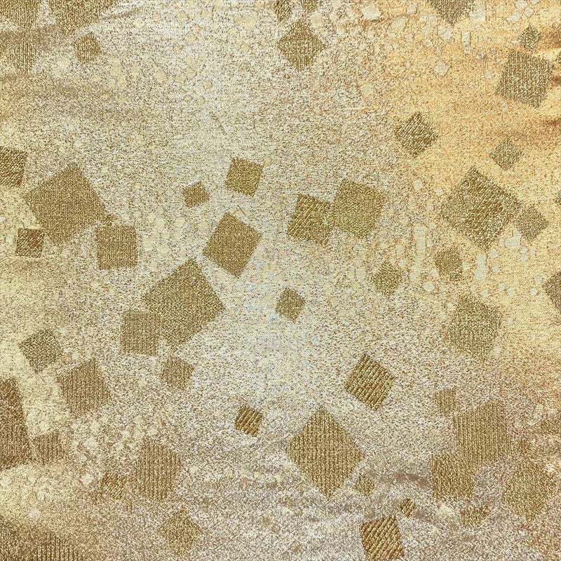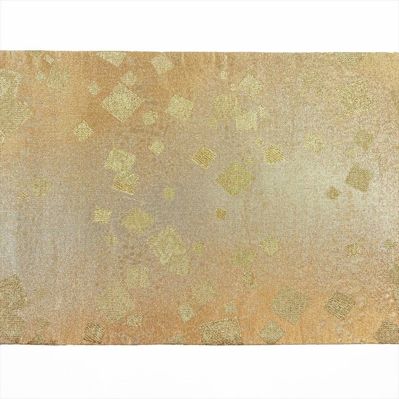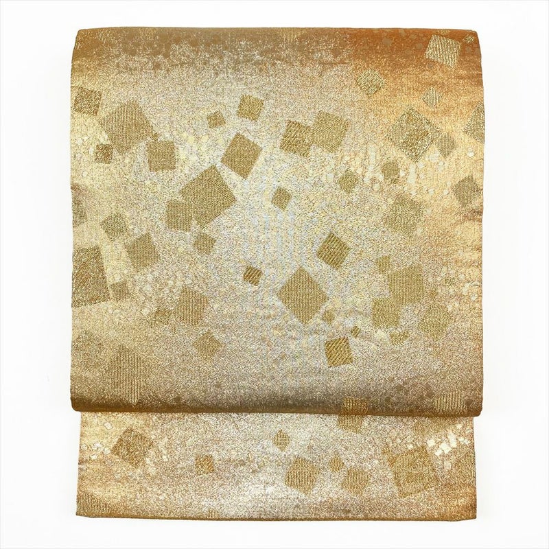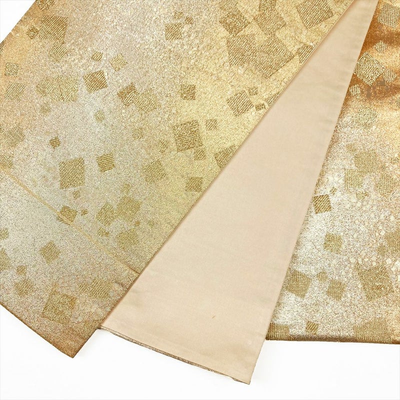 眩い煌めきと、ざっくりとした手ざわりの帯です。フォーマル、セミフォーマル向きです。成人式・結婚式や披露宴・パーティーなどフォーマルのお席にお使いいただけます。裏地の手先からお太鼓にかけて折りジワが見られます。