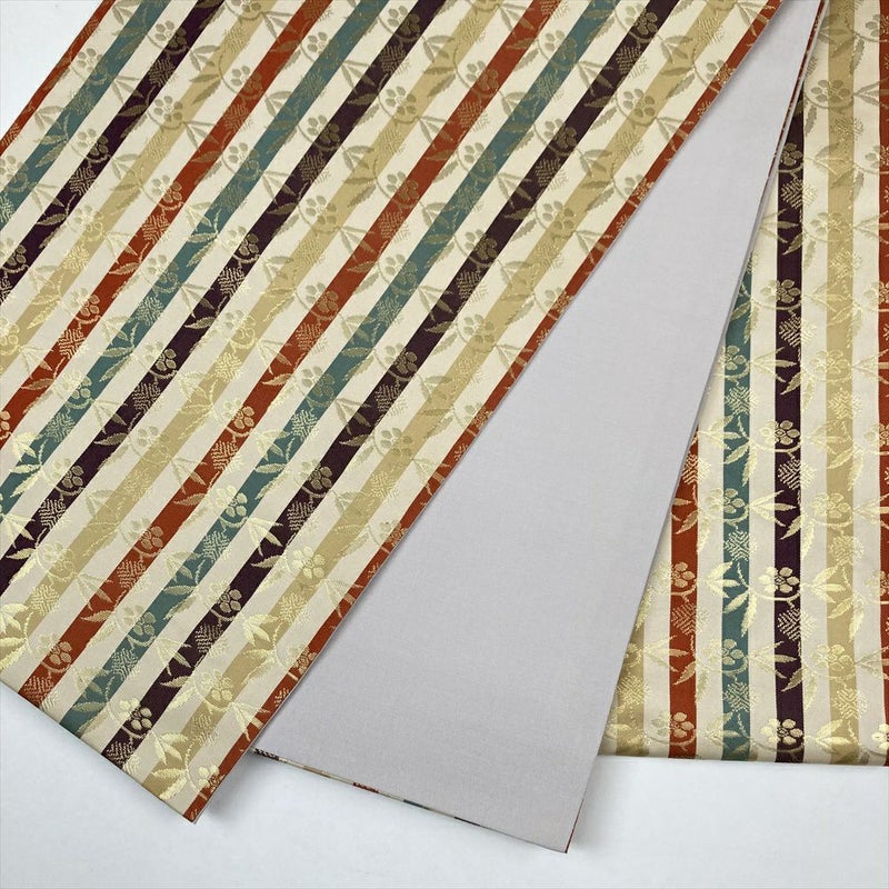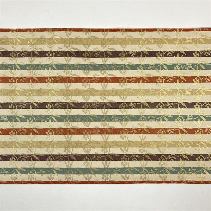 (中古)袋帯 クリーム オレンジ 緑 紫 ベージュ 多色縞 セミフォーマル 金糸 間道 笹蔓 全通