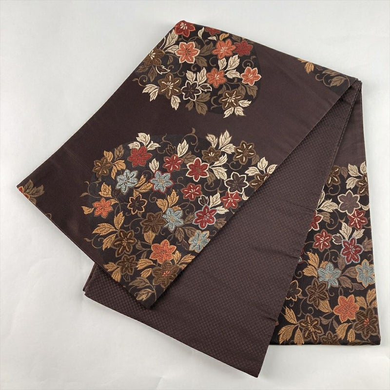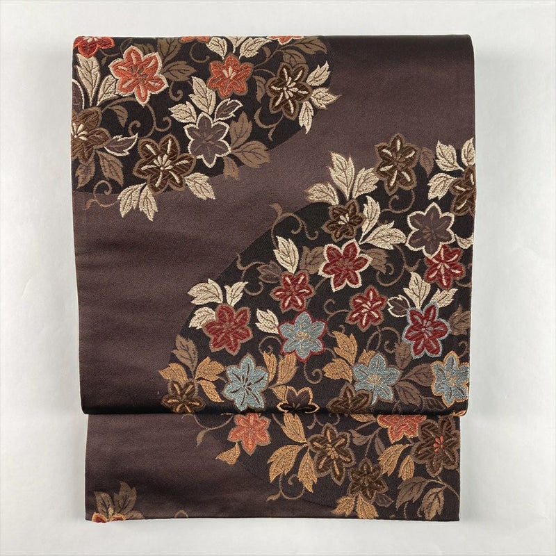 (中古)京袋帯 焦げ茶 カジュアル セミフォーマル 六通 織り 鉄線花 ポリエステル