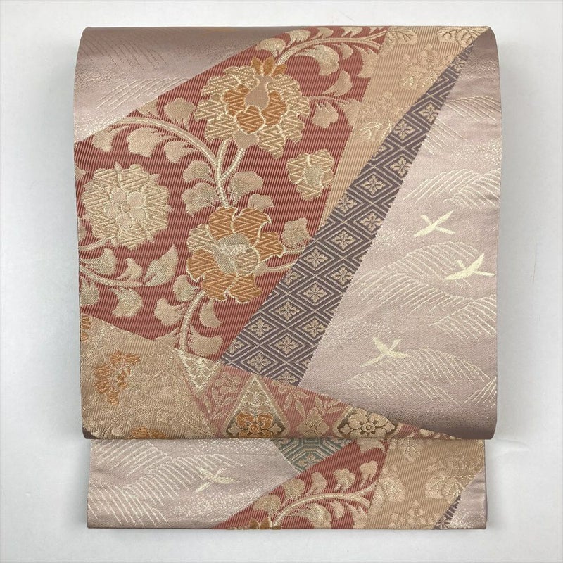 (中古)袋帯 ピンク フォーマル セミフォーマル 六通 切り嵌め 名物裂 牡丹唐草 桐 藤 菱 蜀江 波 鳥