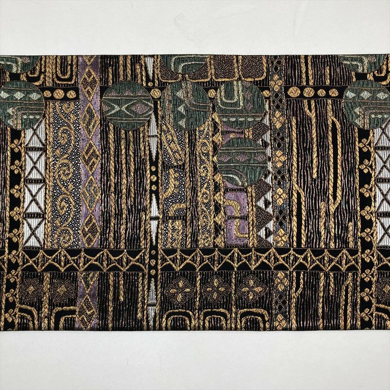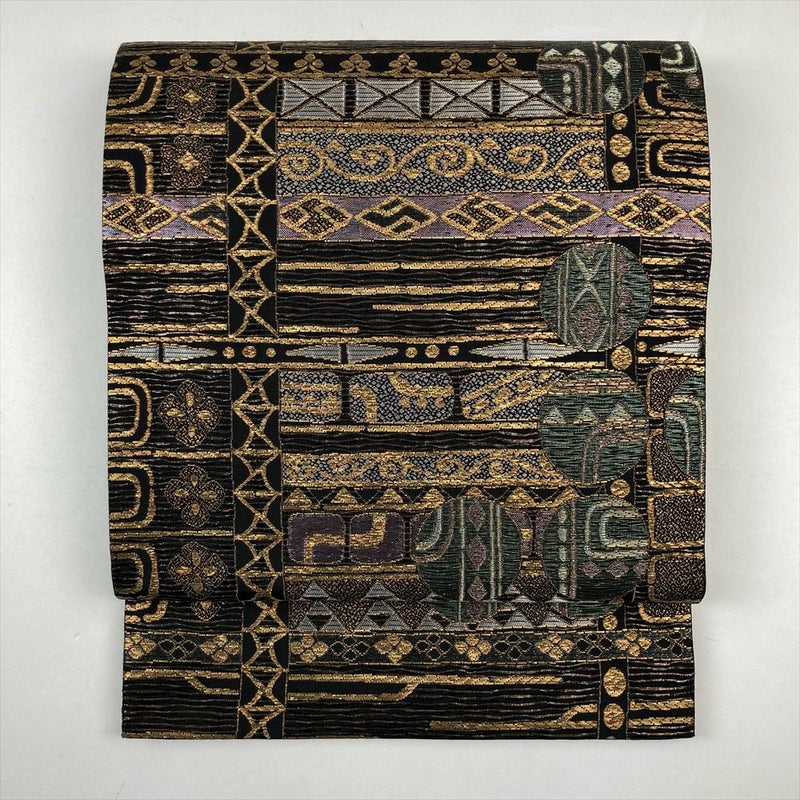 (中古)袋帯 黒 セミフォーマル カジュアル 六通 金糸 銀糸 抽象柄 幾何学