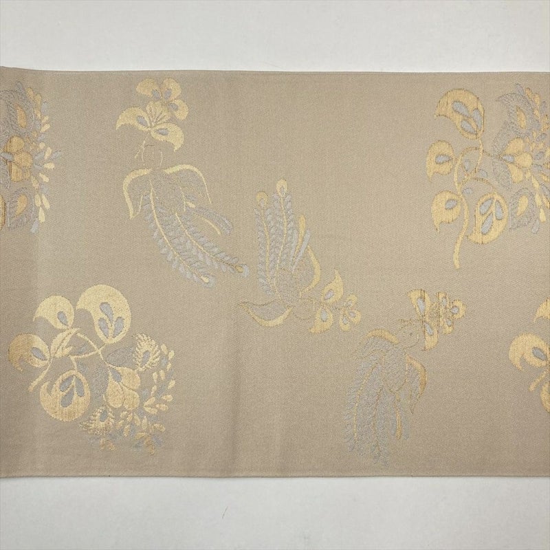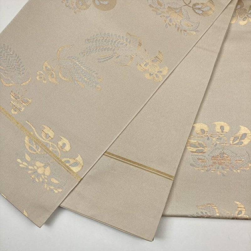 (中古)袋帯 ベージュ セミフォーマル カジュアル 全通 金糸 紹巴 花喰い鳥 オリエンタル