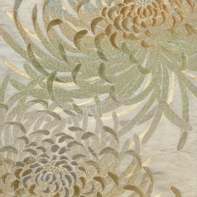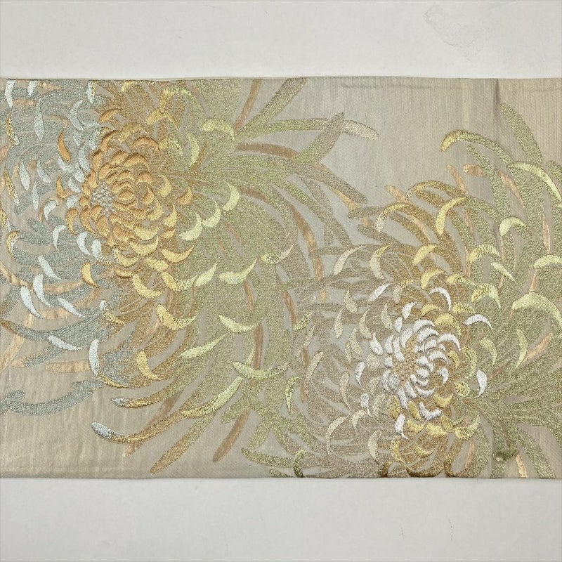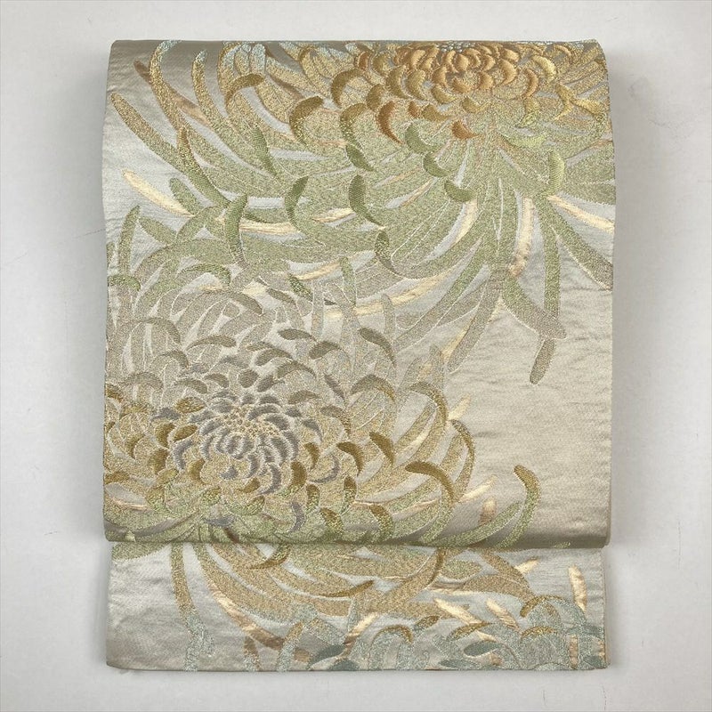 白地に金銀で菊を大胆に織り描いたフォーマル用の袋帯です。