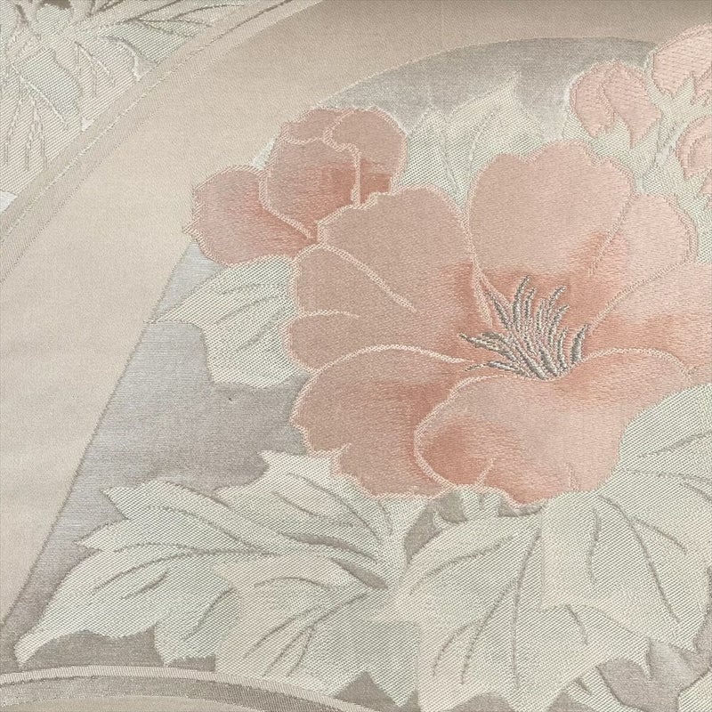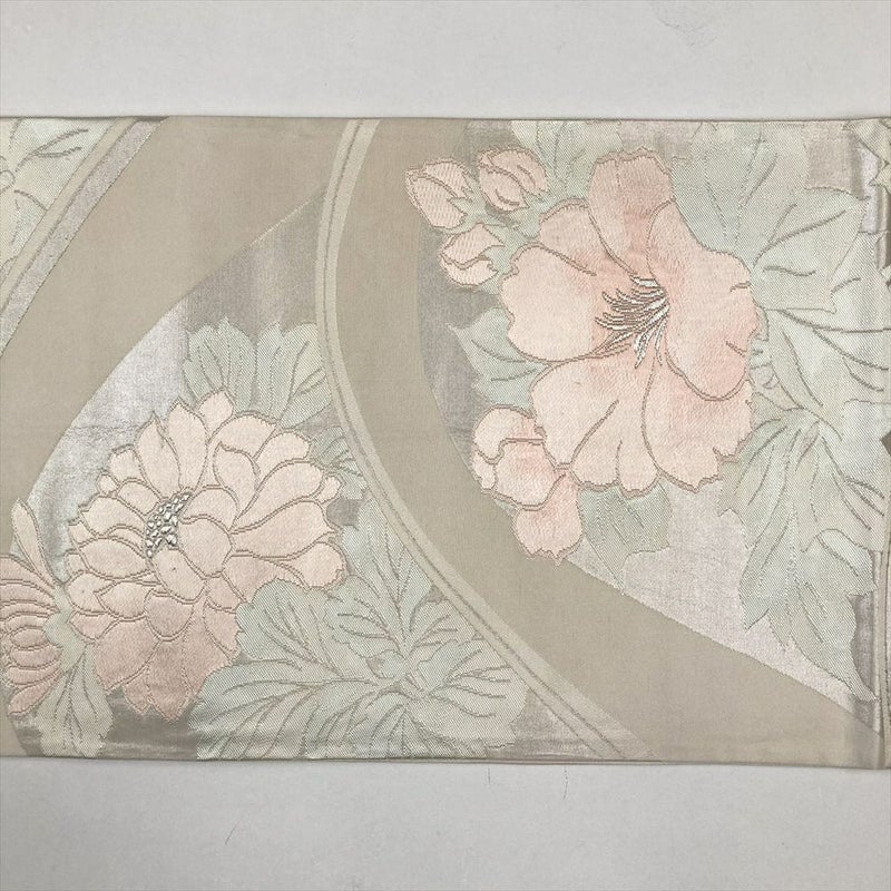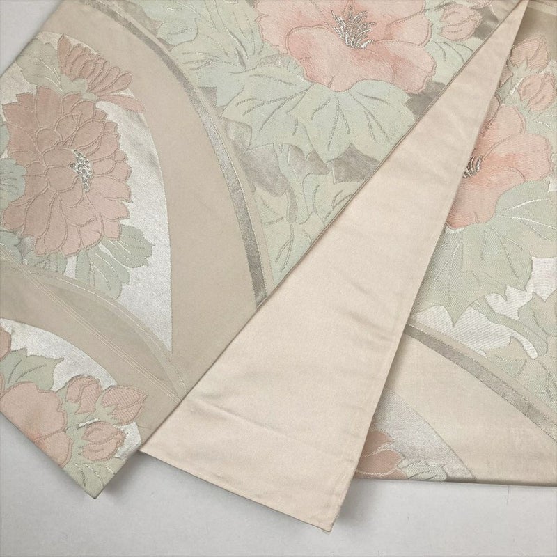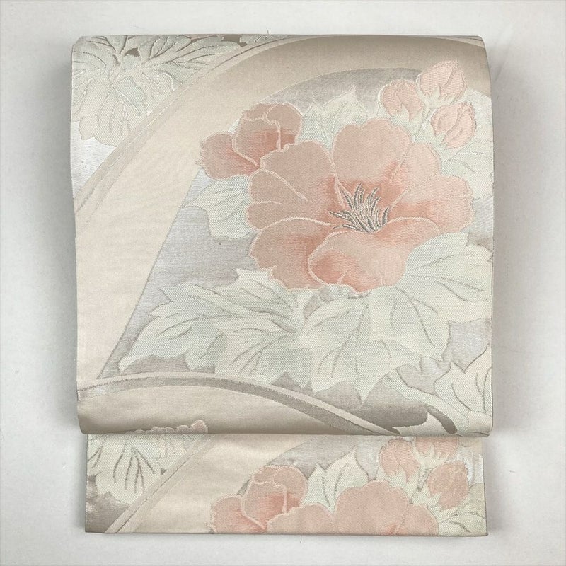 (中古)袋帯 白 セミフォーマル 六通 山取り 切箔 色糸 牡丹
