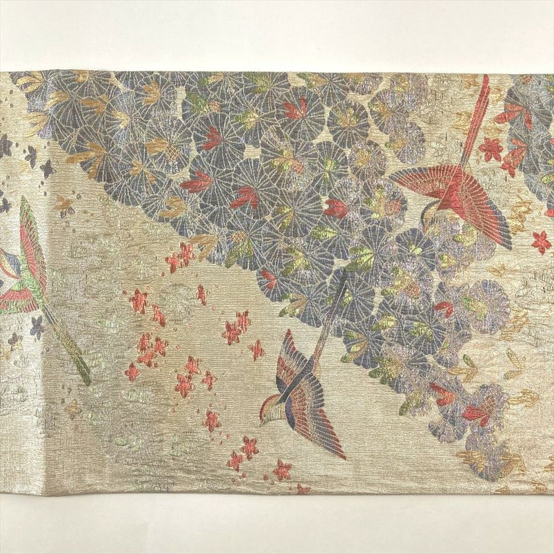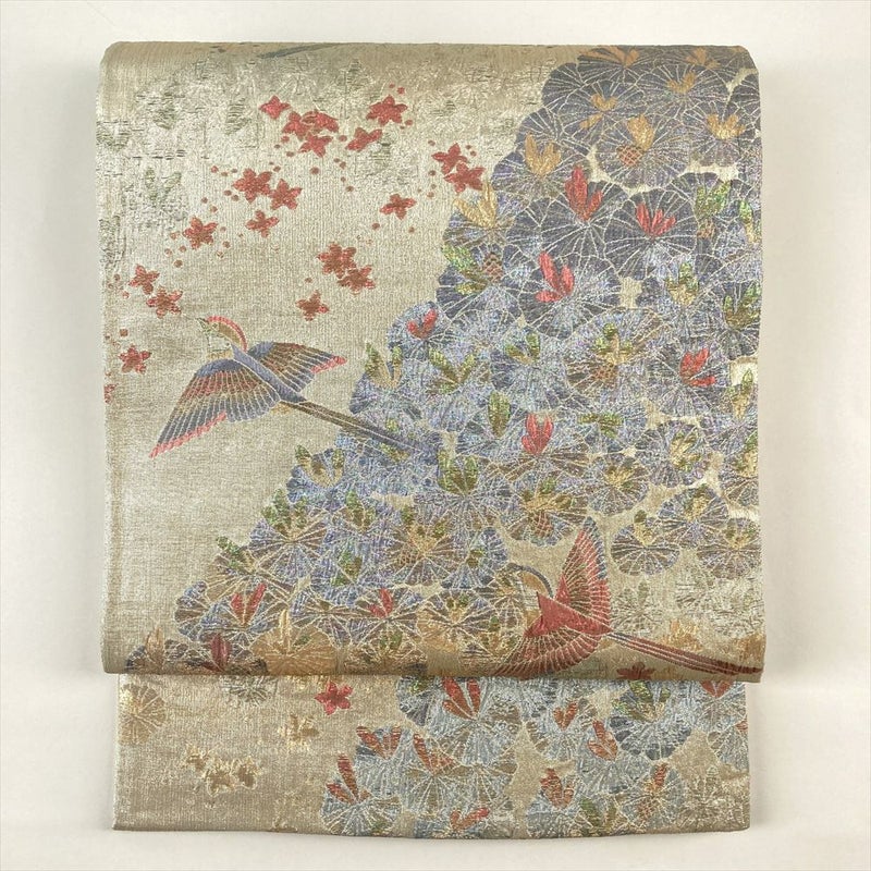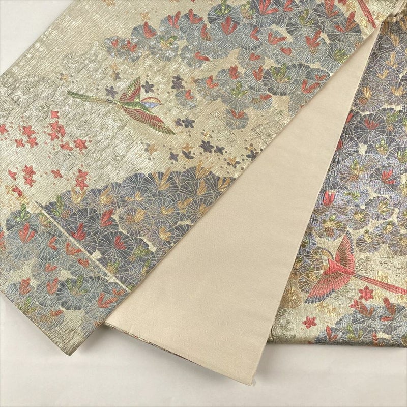 (中古)袋帯 銀 セミフォーマル 六通 金糸 銀糸 色糸 鳥 花