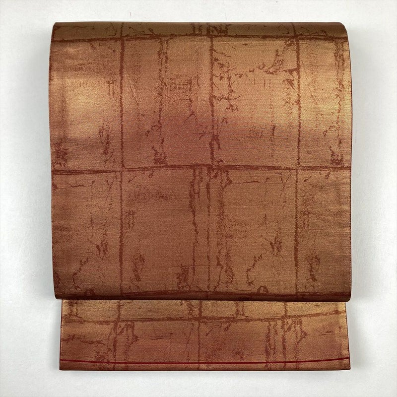 金屏風のような地が印象的です、ほどよい張りと柔らかさがあります。装いが品よくまとまります。 手先からお太鼓の山にかけて折りシワ締めシワが見られますが着用には問題の無い程度と思われます。全体に金糸が施されており、角度によって色が違って見える可能性がございます。