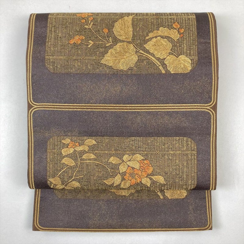 (中古)京袋帯 紫 セミフォーマル カジュアル 六通 金糸 垣根 四季花
