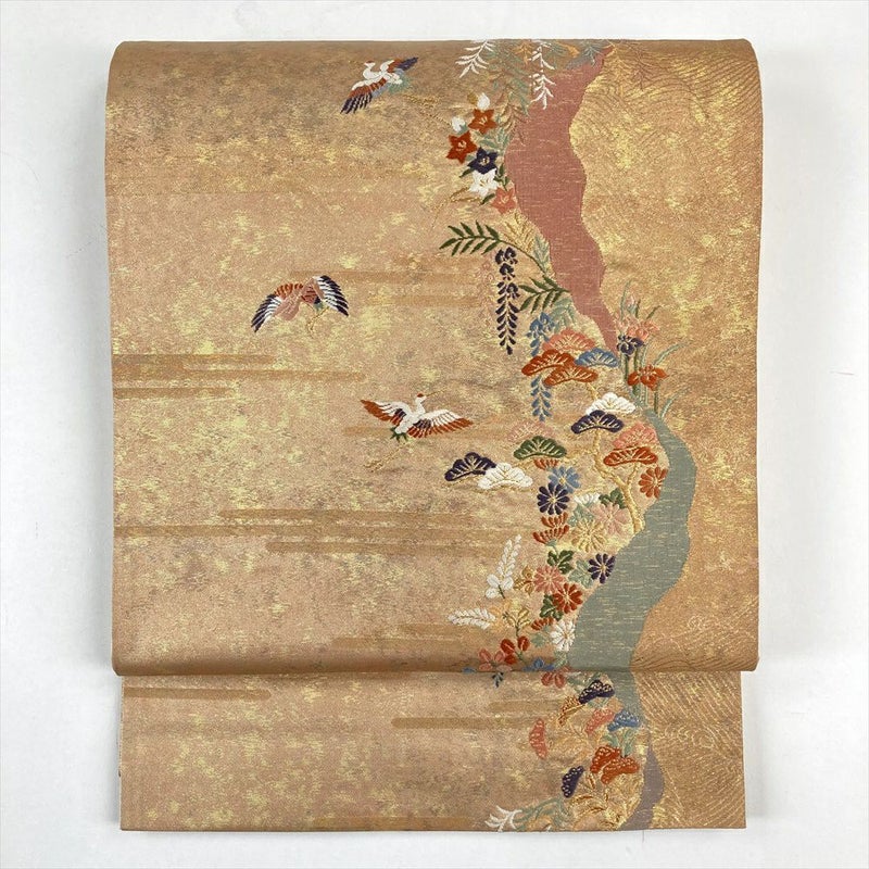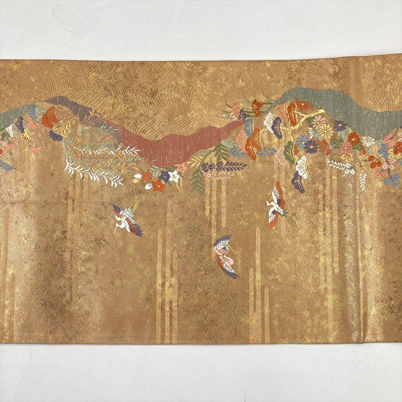 (中古)袋帯 金 ベージュ フォーマル セミフォーマル 六通 切箔 金糸 色糸 道長取り 四季花 鶴 波