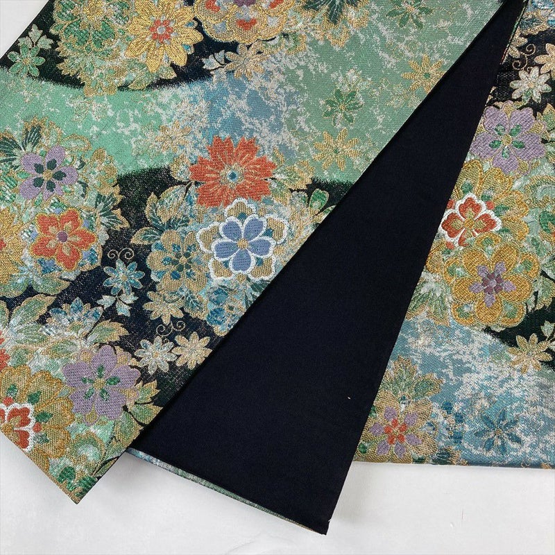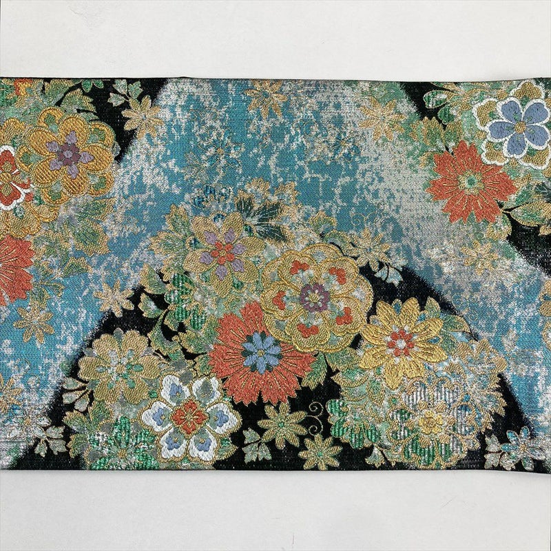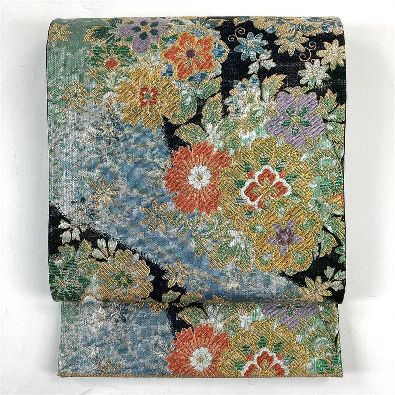 (中古)袋帯 黒 フォーマル セミフォーマル 六通 切箔 金糸 色糸 花の丸