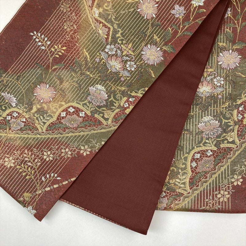 (中古)袋帯 臙脂 カーキ フォーマル セミフォーマル 六通 金糸 変わり縞 干割れ 唐花 グラデーション オリエンタル