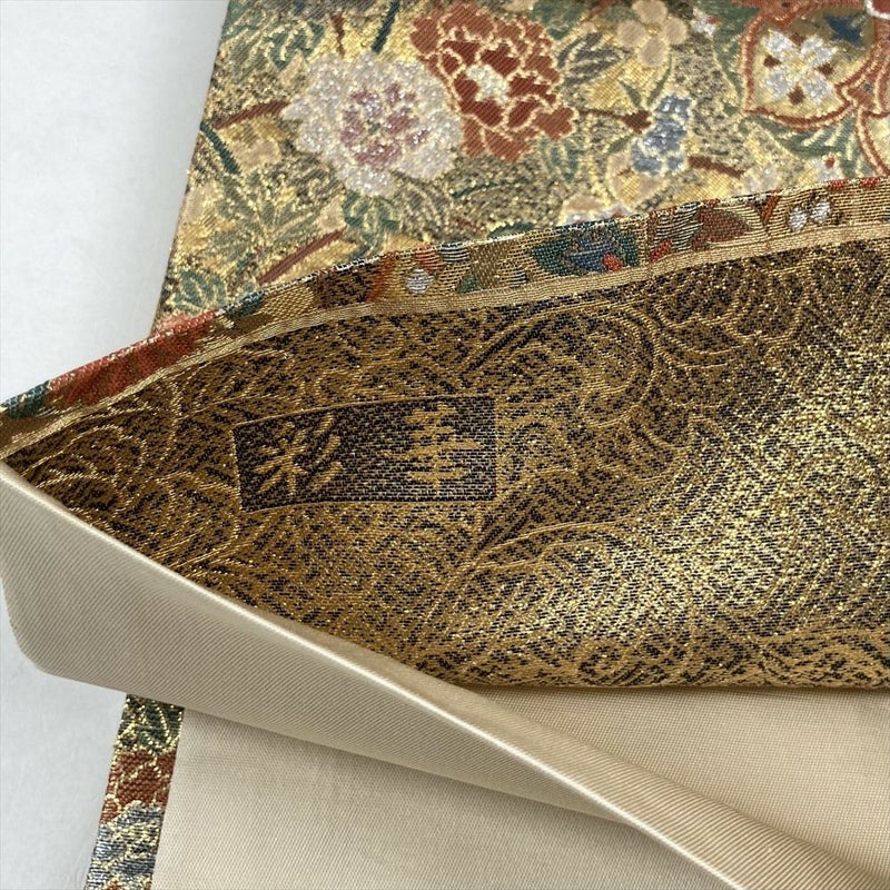(中古)袋帯 金 ベージュ フォーマル セミフォーマル 六通 切箔 金糸 華文 向かい鳥 四季花 オリエンタル