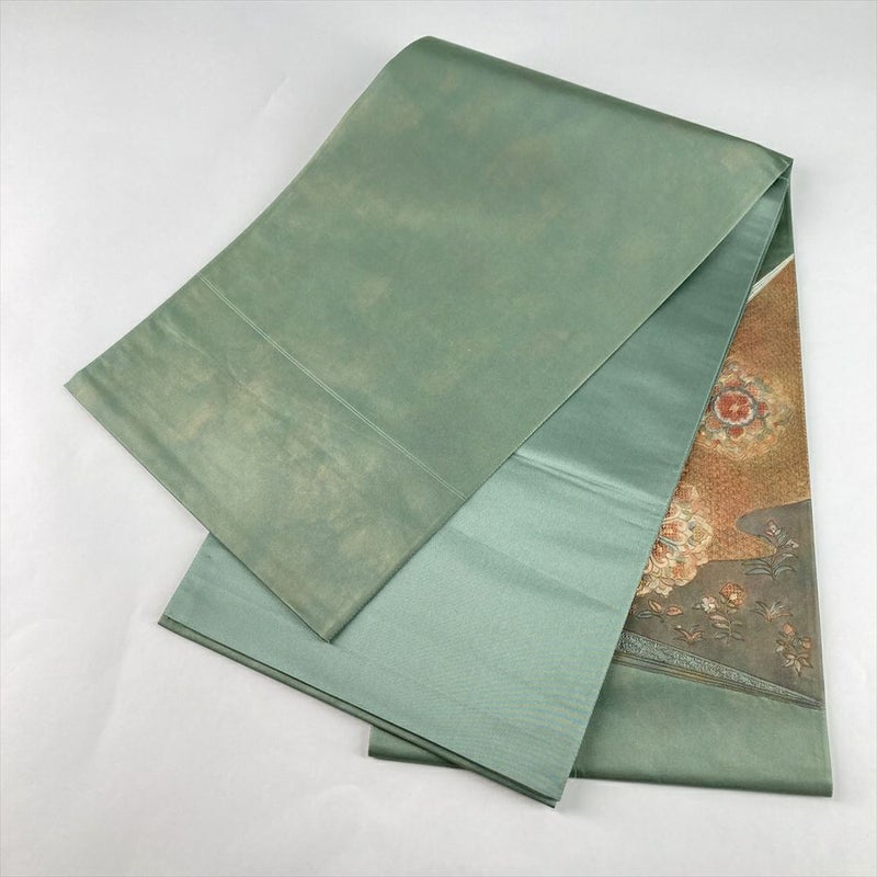 (中古)袋帯 緑 セミフォーマル 六通 刺繍 華文 唐花 七宝 絹