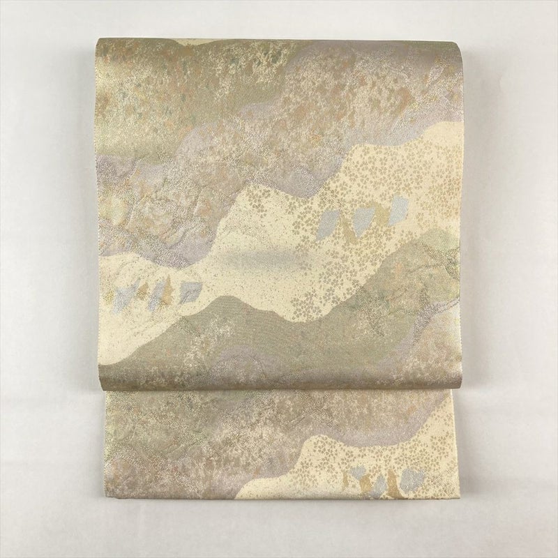 (中古)袋帯 クリーム セミフォーマル 六通 引き箔 道長取り 鶴 絹