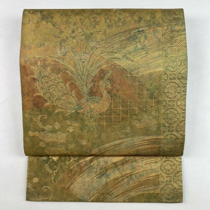 (中古)袋帯 金緑 セミフォーマル フォーマル 六通 織り 天平 孔雀 絹