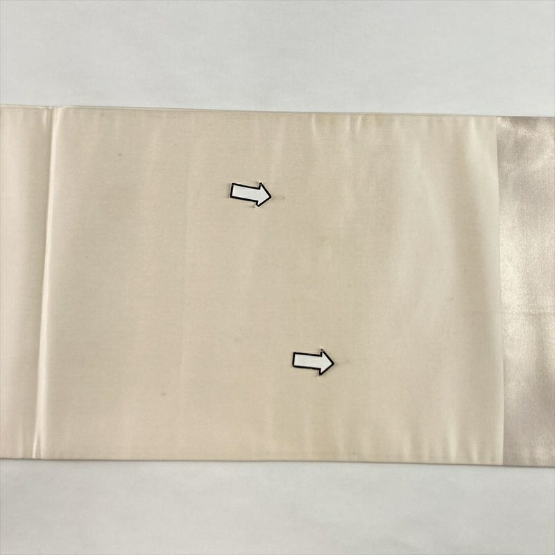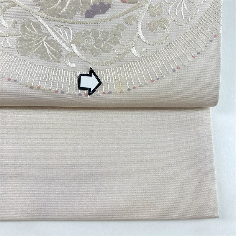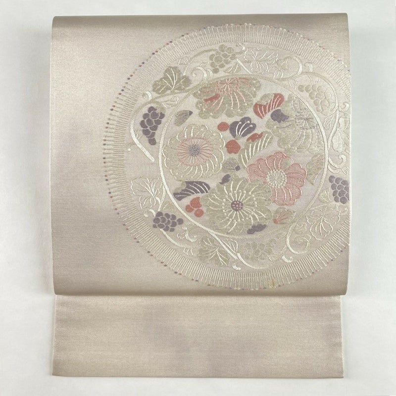 (中古)袋帯 薄金銀 セミフォーマル 六通 織り 刺繍 花絵皿 絹