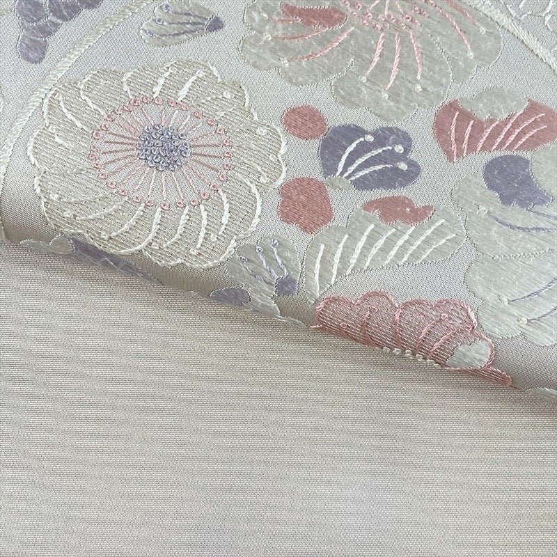 清々しい白銀の地に、繊細な刺繍で花絵皿の文様を描いた袋帯です。