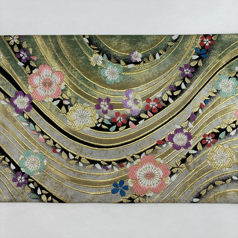 (中古)袋帯 金緑 セミフォーマル フォーマル 六通 織り 流水 桜 絹