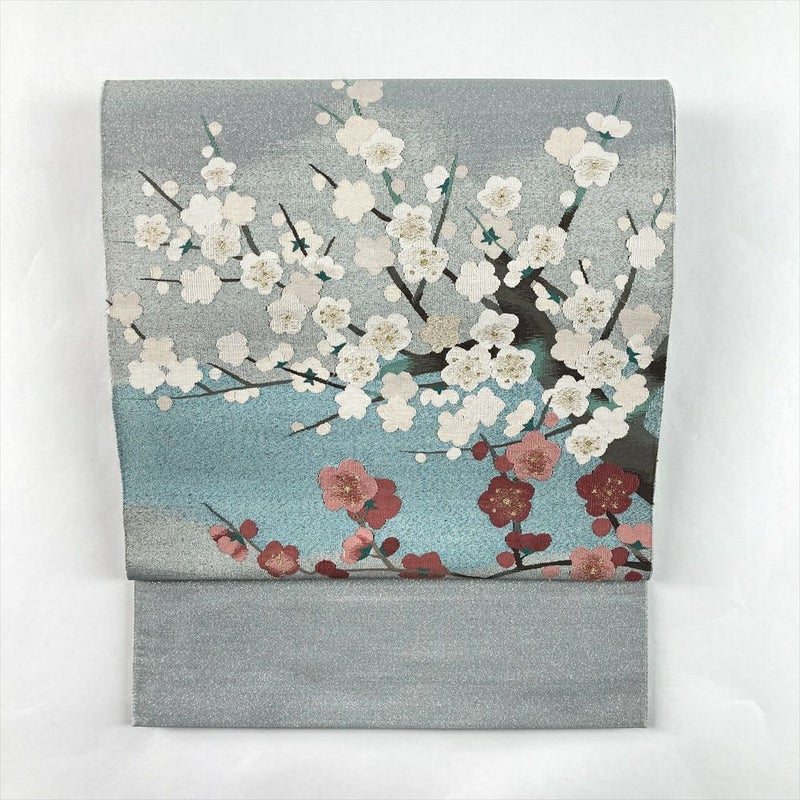 (中古)袋帯 銀鼠 グレー 薄水色 セミフォーマル フォーマル 六通 綴れ織り 紅白梅 絹