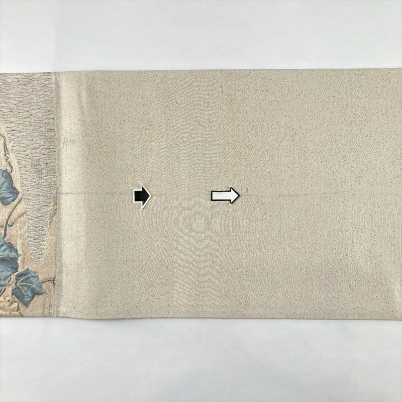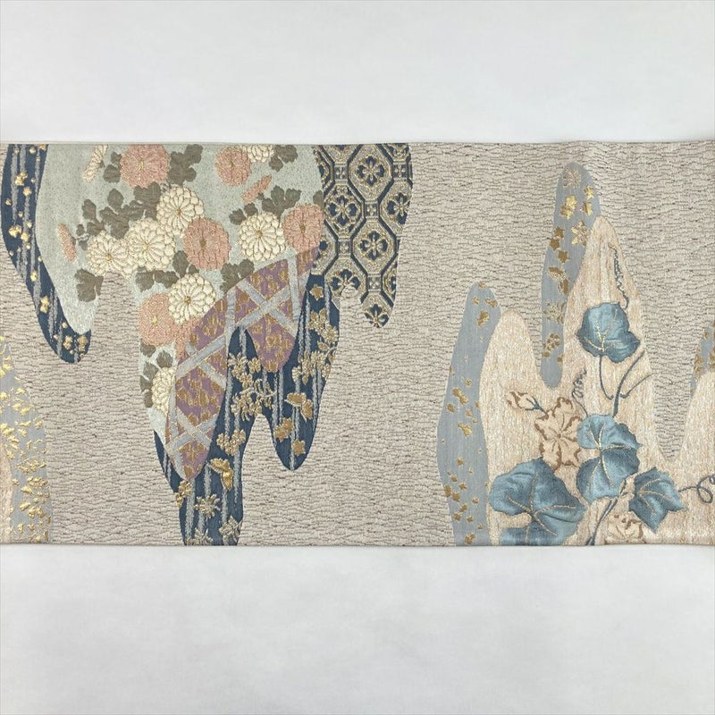 (中古)袋帯 金 ベージュ セミフォーマル フォーマル 六通 織り 霞 琳派花草文 絹