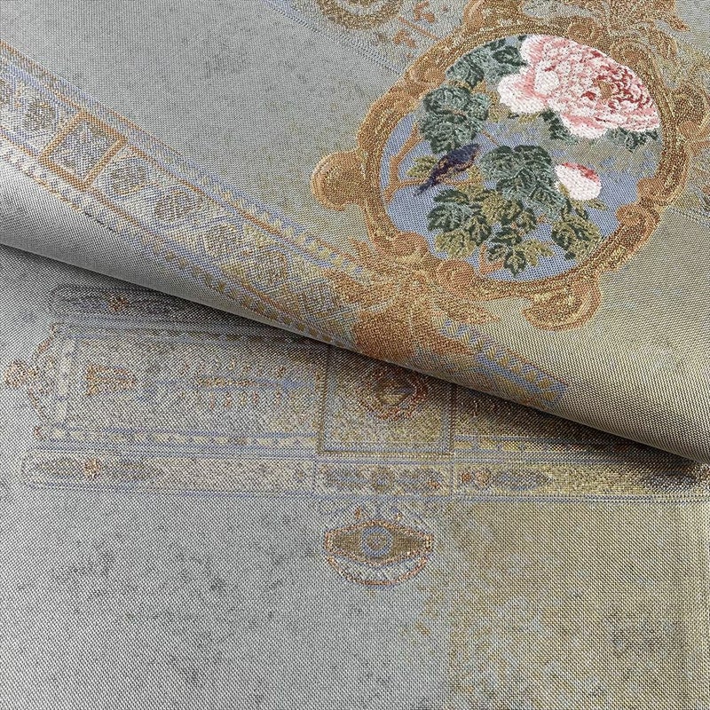 華やかな金色のフレームの中に、優美な花鳥が織り出された、まるで絵画のような袋帯です。