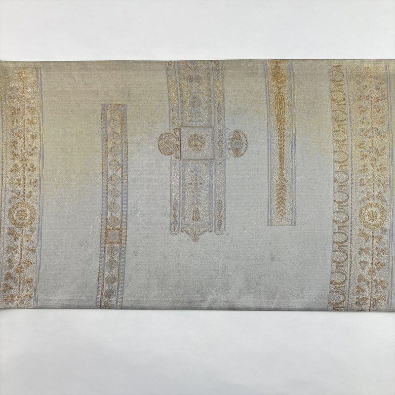 (中古)袋帯 銀 セミフォーマル フォーマル 六通 織り 洋風 フレームに花鳥文 絹