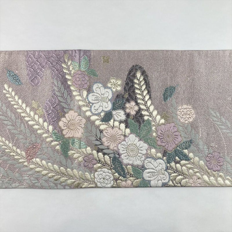 金、銀、紫の糸が織りなすグラデーションが、光を受けて幽玄な輝きを放ちます。