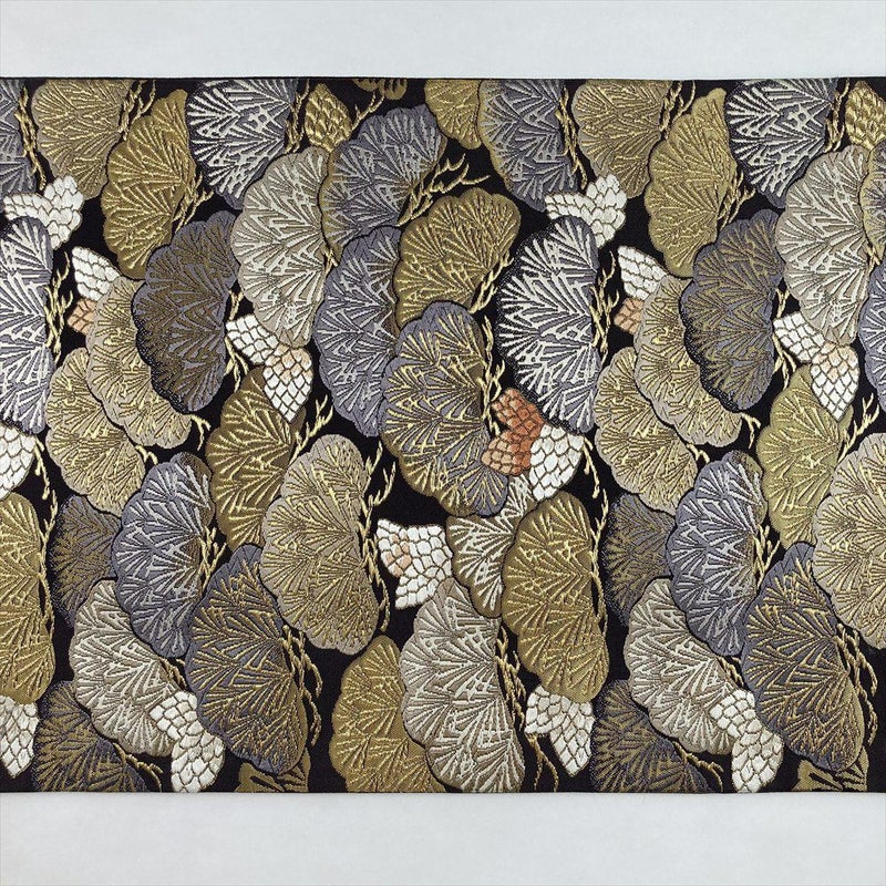しっとりとしたチャコールグレーの地に、金糸で丁寧に織り上げられた松文様が格調高く輝く袋帯です。