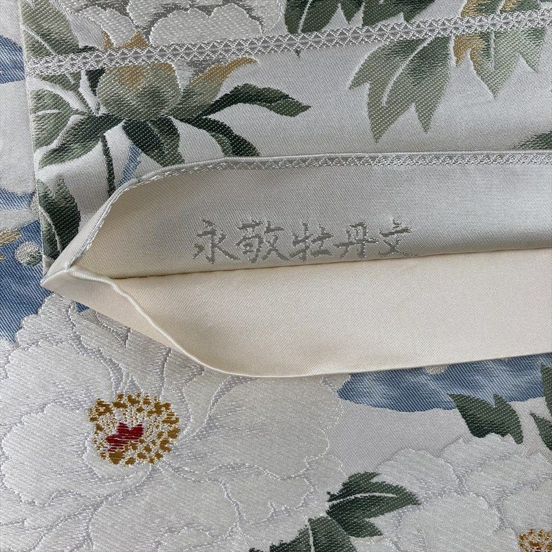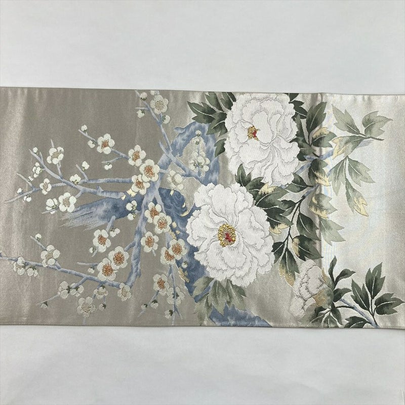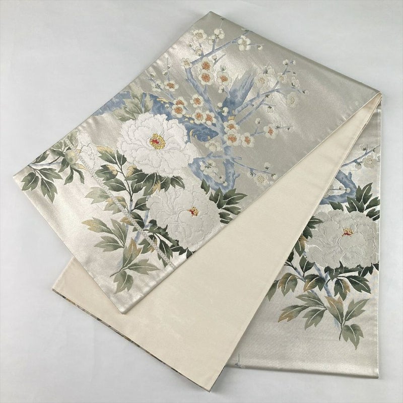 銀色の地に、白く気品あふれる牡丹と梅の花を織り上げました。