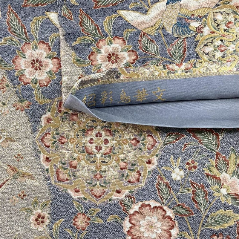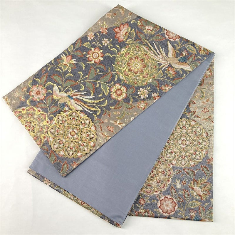 澄んだブルーグレーの地に、金色の華文と鳳凰が舞う、格調高い袋帯です。