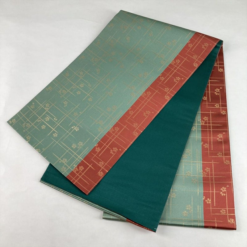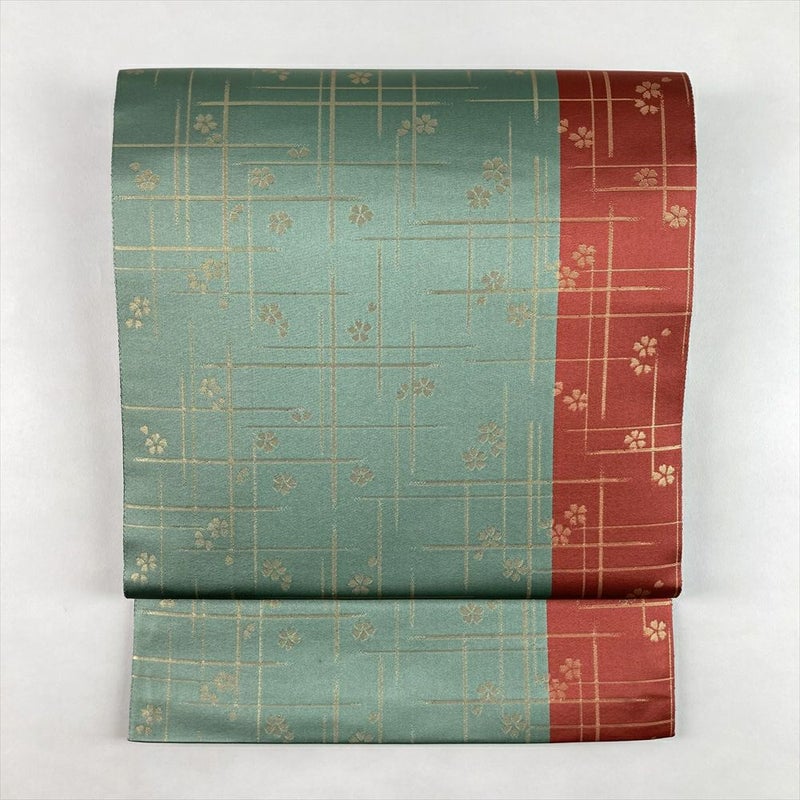 (中古)袋帯 薄緑 薄赤 カジュアル セミフォーマル 全通 金糸 色糸 破れ格子 桜 絹