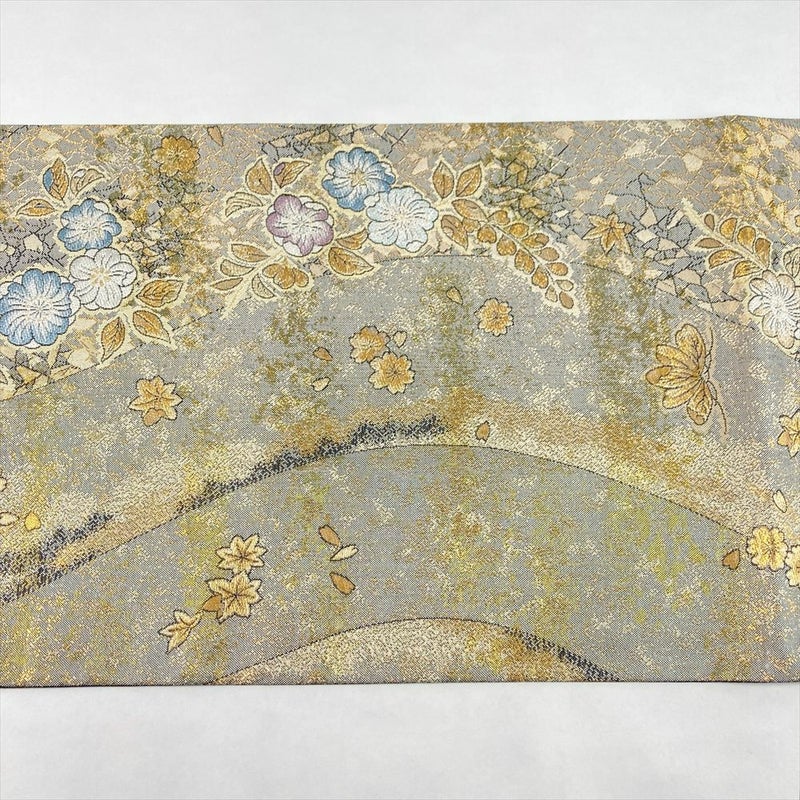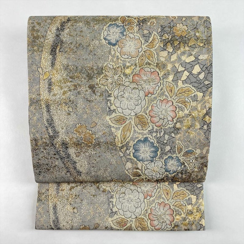 (中古)袋帯 白茶 金 銀 セミフォーマル フォーマル 六通 織り 金糸 銀糸 辻が花 絹