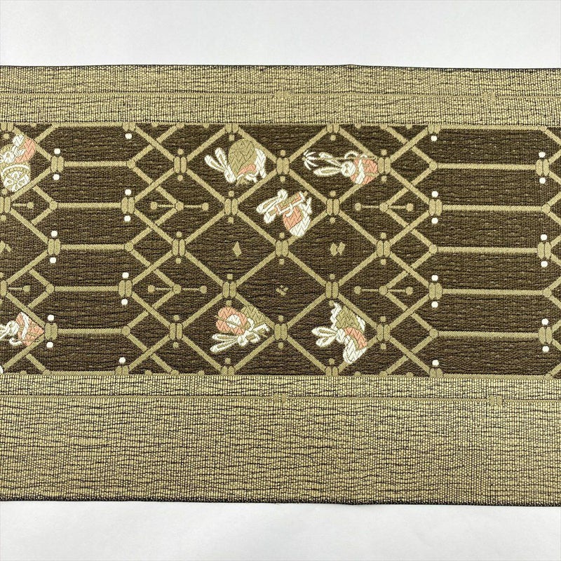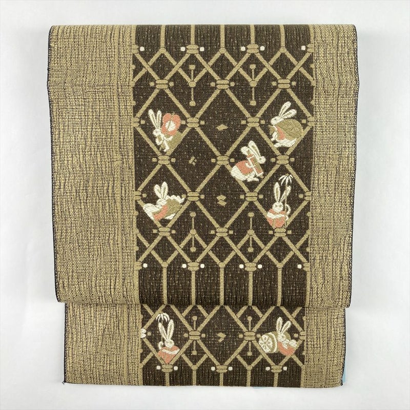 金茶色の地に愛らしい兎を織り込んだ名古屋帯。