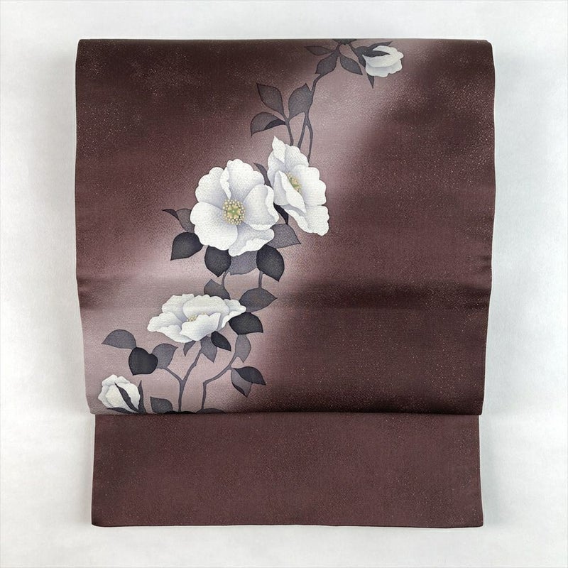 (中古)袋帯 焦げ茶 カジュアル セミフォーマル 六通 銀通し 染め 白い花 絹