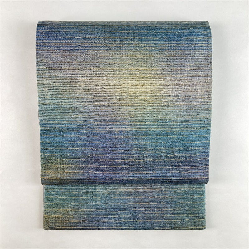 (中古)袋帯 青緑 セミフォーマル 全通 纐纈暈繝錦 草木染 織り 横段 ぼかし 絹