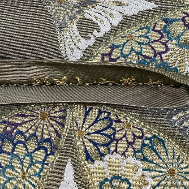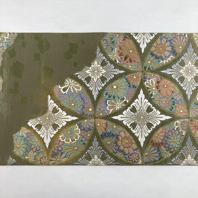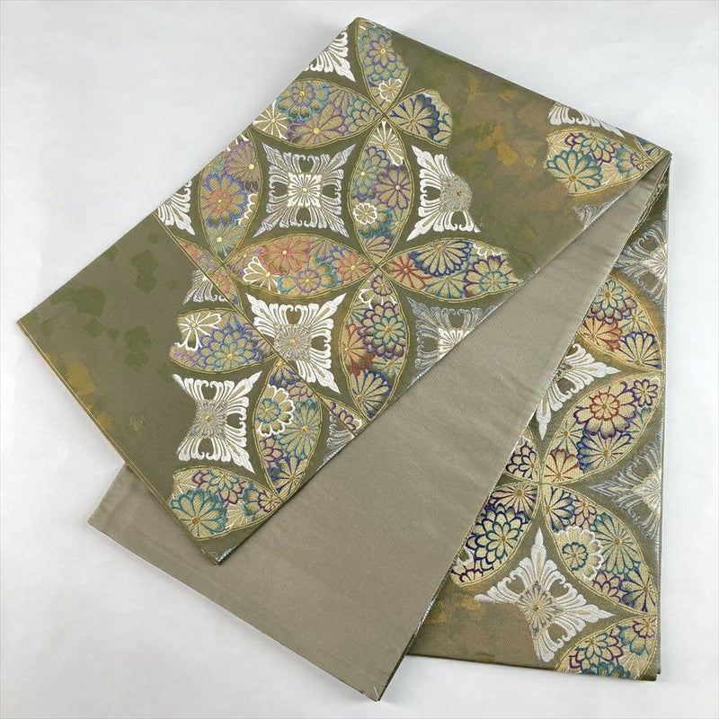 (中古)袋帯 柳茶 緑 セミフォーマル フォーマル 六通 織り 破れ七宝華文 絹