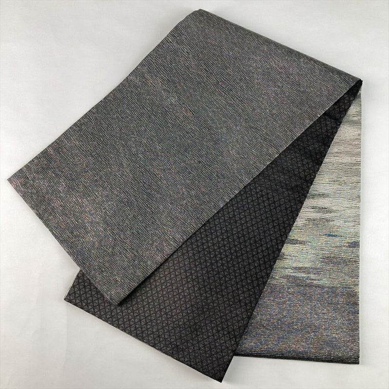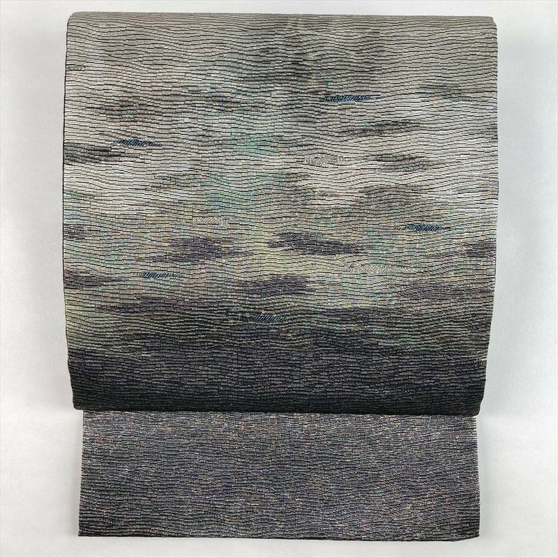 (中古)袋帯 銀 黒 セミフォーマル 六通 織り引き箔 幽玄 水面 霞 絹