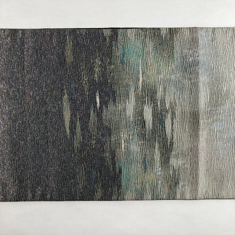 銀地に引き箔で表現された水面と霞が、幽玄な美しさを漂わせる袋帯。