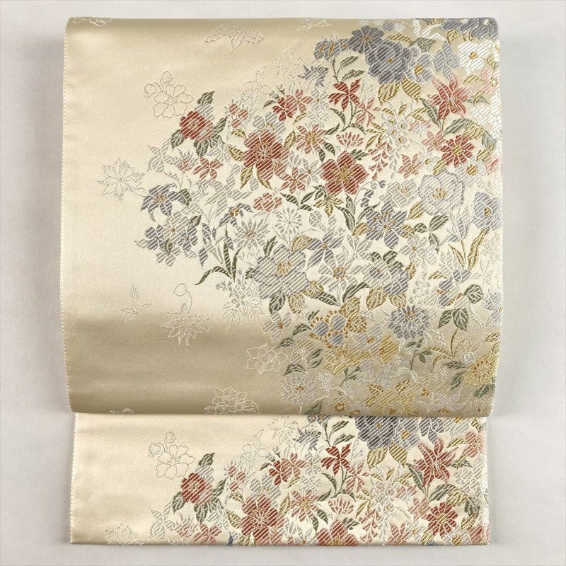 (中古)袋帯 淡黄 セミフォーマル 全通 織り 花 ボタニカル 絹