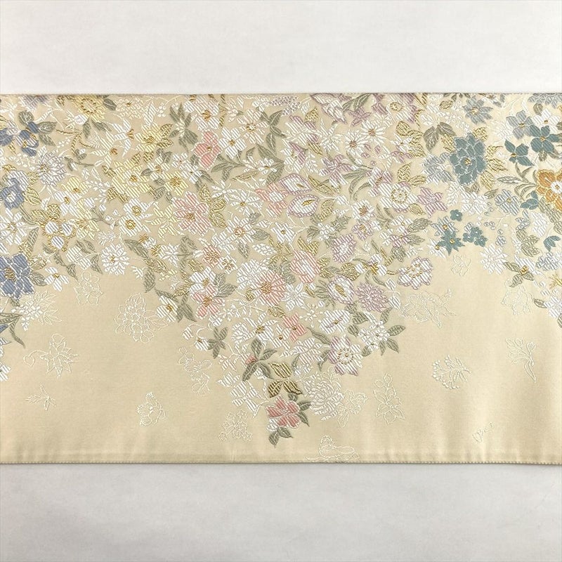 淡黄の優しい色合いが魅力の全通柄袋帯。