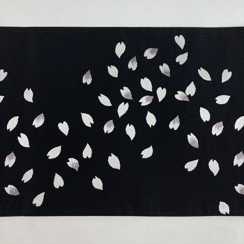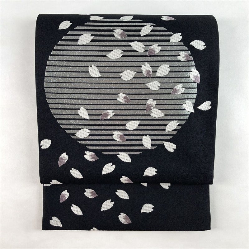 黒地に桜の花吹雪が舞う、上品な意匠の六通袋帯。
