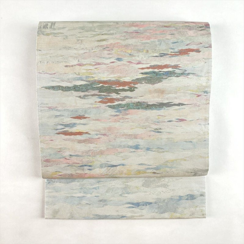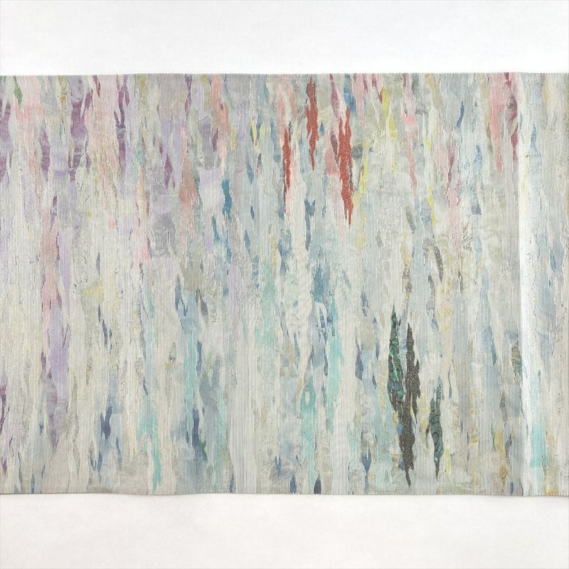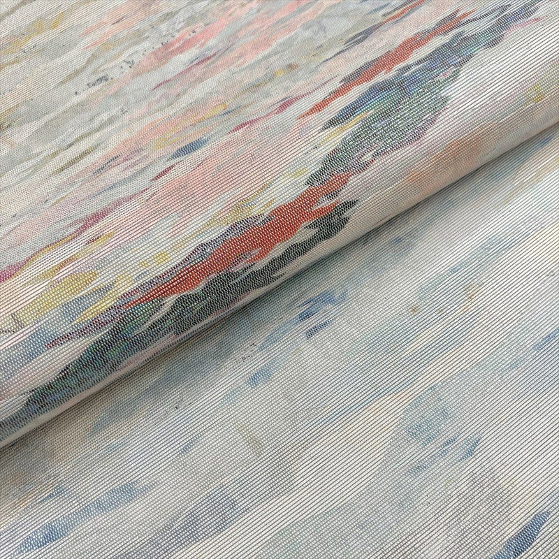 銀や薄水色の上品な色調に、紀州螺鈿の輝きが美しく映える六通袋帯。