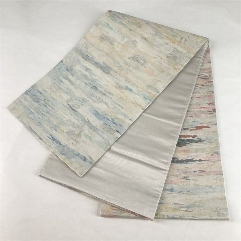 (中古)袋帯 銀 薄水色 カジュアル セミフォーマル 六通 織り 紀州螺鈿 絹