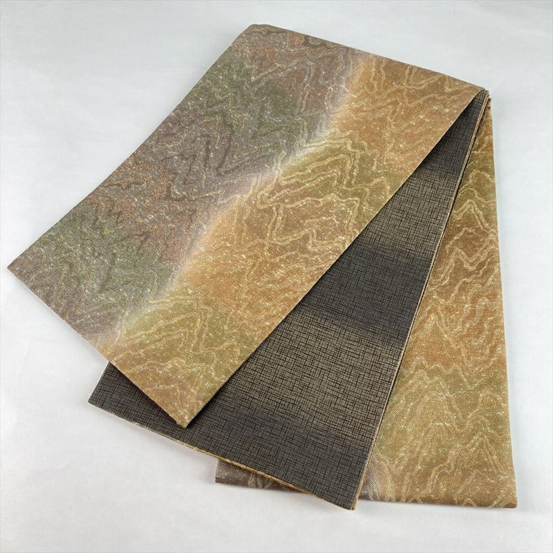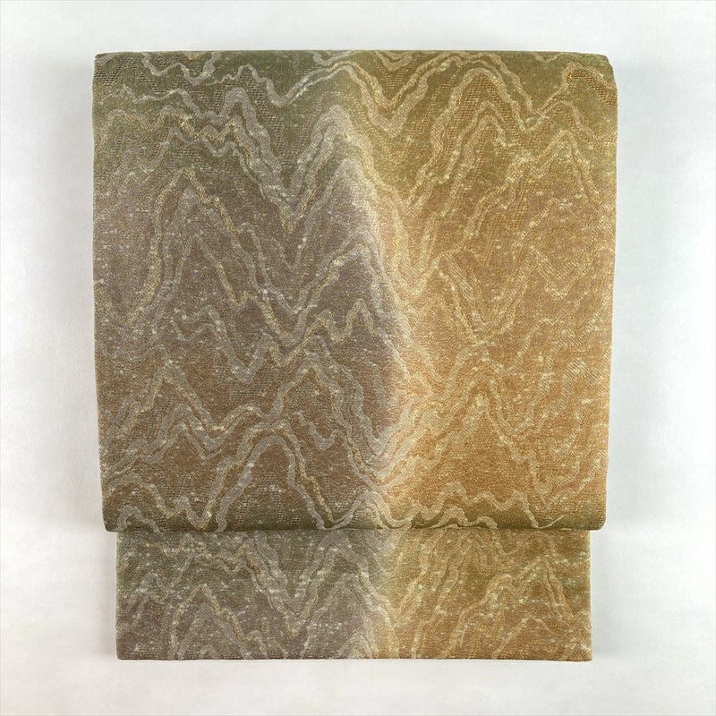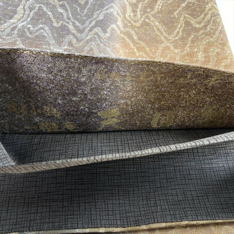金と茶のぼかしが織りなす重厚な趣、天目綿の名匠・山本富男による全通袋帯。