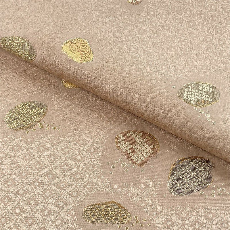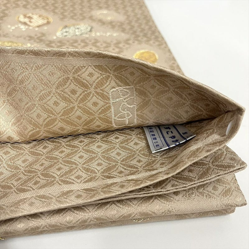 やわらかな薄茶地に、織りで表現された七宝と貝模様が上品に広がる袋帯。