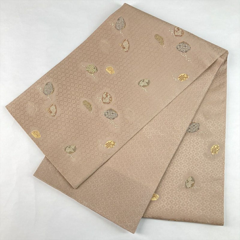 (中古)袋帯 薄茶 ベージュ セミフォーマル 六通 織り 七宝 貝 絹